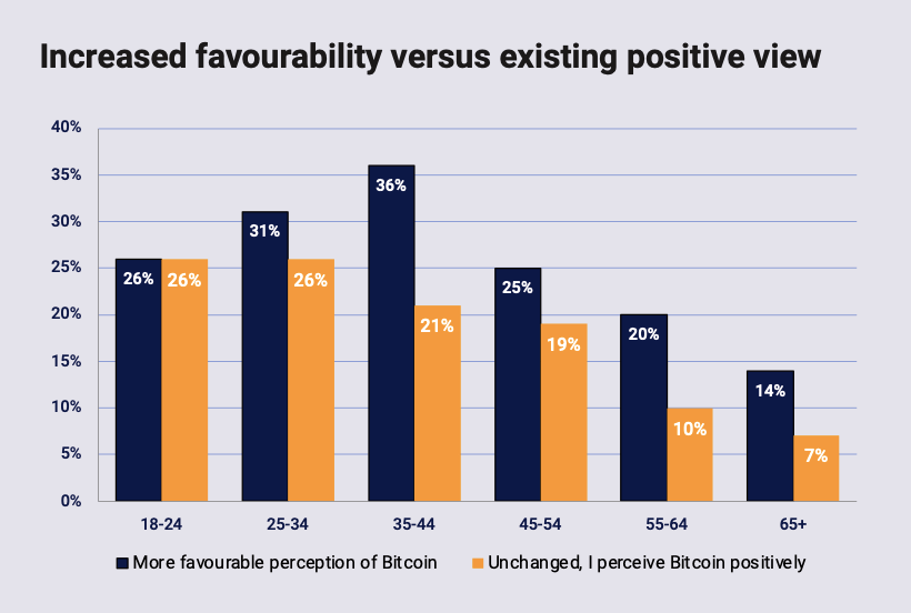 According to the study, many of the interviewed people had a “more favorable perception of Bitcoin.” The change in perspective includes the older generation, as Australians 55 and older are “warming up” to the flagship cryptocurrency and crypto investments.