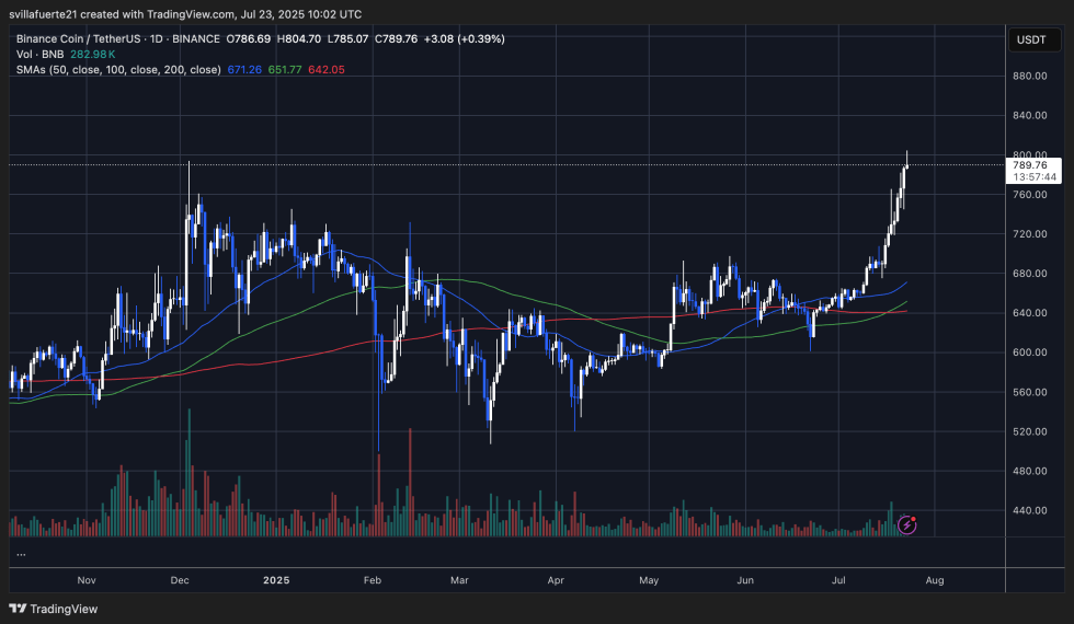 Binance Coin (BNB) has officially ventured into a new price realm, achieving an unprecedented high of $804. The current technical analysis reflects a sustained uptrend, with BNB climbing from around $670 in early July to nearly $800 within weeks. This upward trajectory indicates increasing bullish momentum and market confidence.