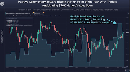 In a recent post, Santiment reiterated that the general sentiment towards Bitcoin appears quite positive, suggesting a strong likelihood of significant price movements in the crypto markets. After Bitcoin retraced to below $65,000 on September 30, they anticipate some panic selling. If the fear of missing out (FOMO) shifts to fear, uncertainty, and doubt (FUD), the bullish trend could quickly resume.
