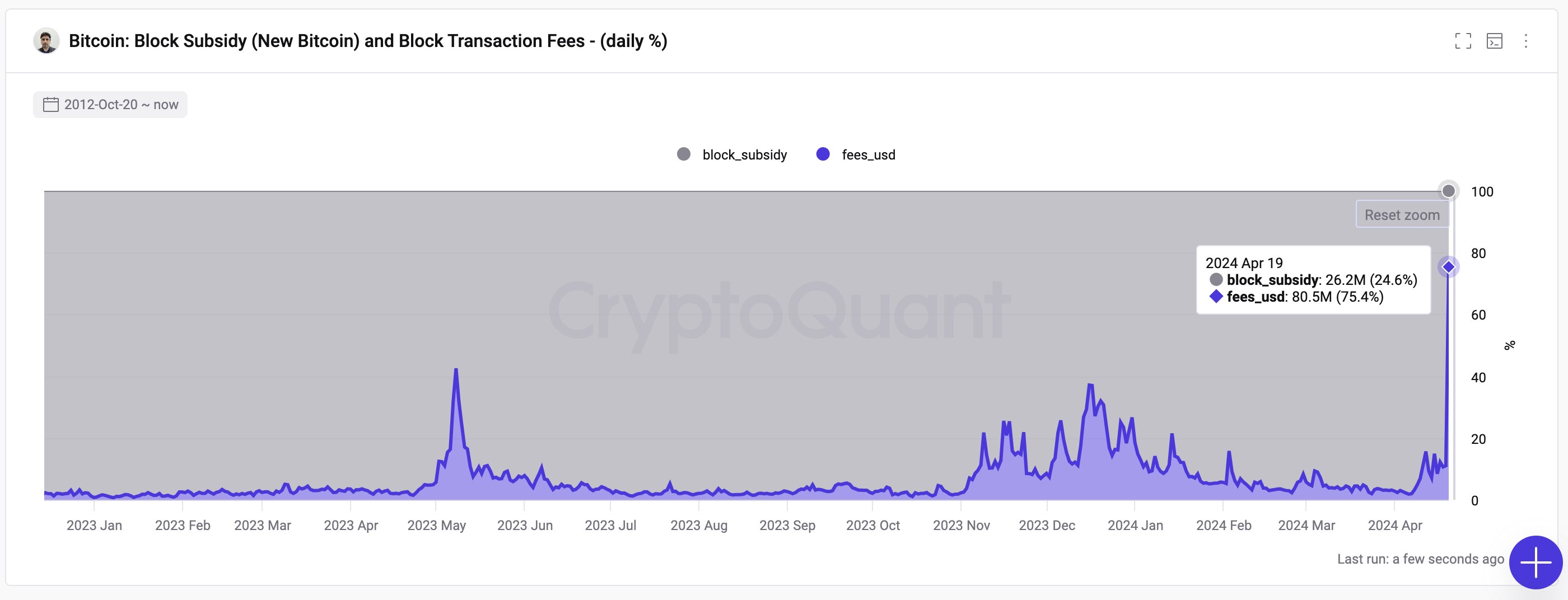 The Runes appear to have followed in this lead, as the transaction fees on the network has also shot up since they have been introduced. As CryptoQuant Head of Research Julio Moreno pointed out yesterday in an X post, the miner revenue from transfer fees shot up to 75% alongside the Runes launch.