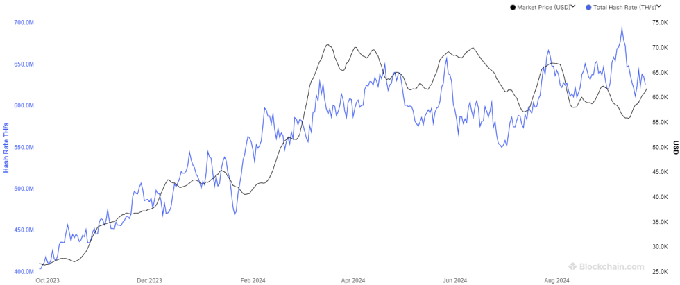 The chart shows that although the Bitcoin Mining Hashrate reached a new high earlier this month, it has since fallen sharply.