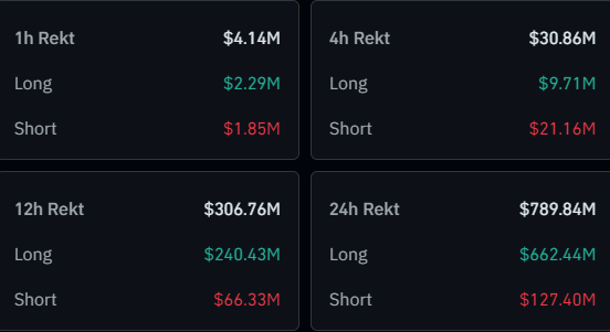 The data shows nearly $790 million in cryptocurrency liquidations over the past day, with long positions accounting for $662 million—about 84% of the total. This is primarily attributed to the market’s broad downturn.