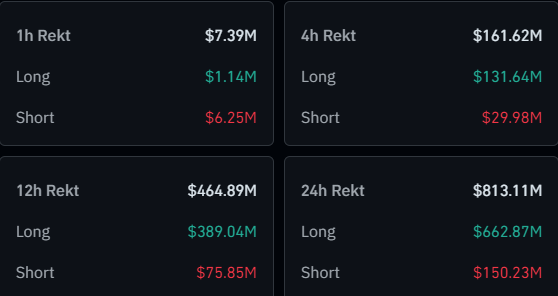 According to data from CoinGlass, the cryptocurrency derivative market has observed total liquidations amounting to a whopping $813 million during the past 24 hours.