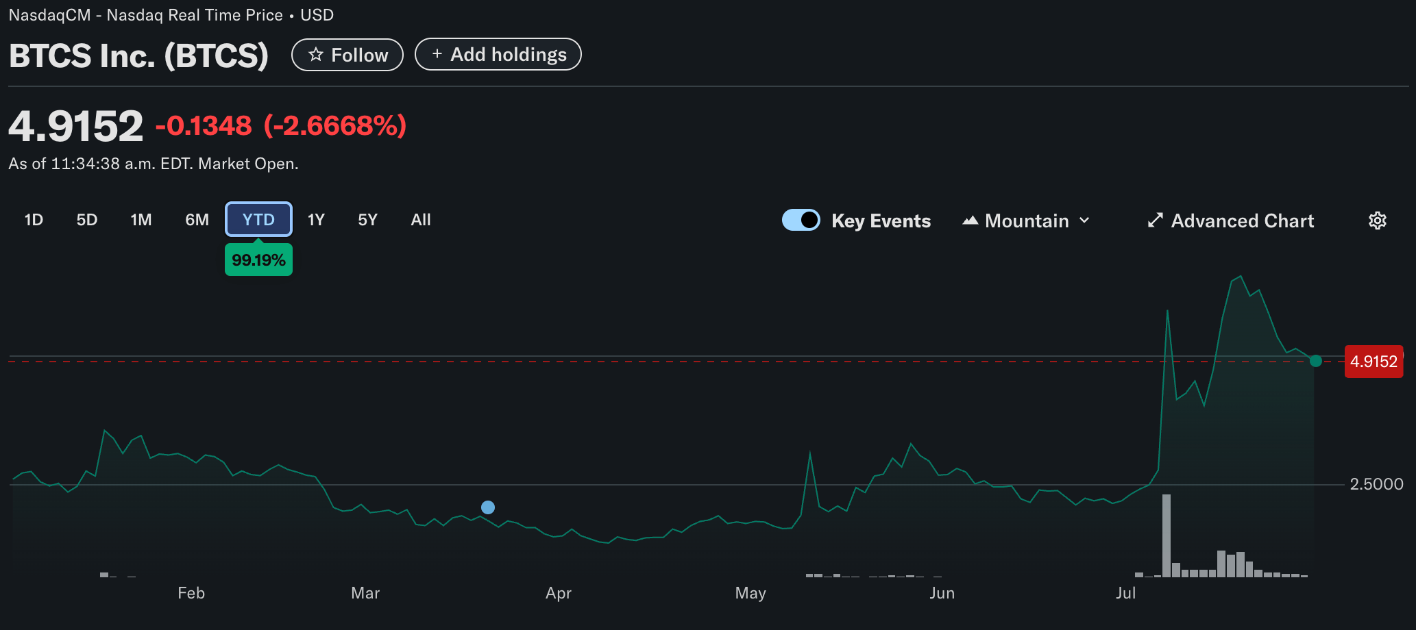 Currently, BTCS shares experienced a minor dip, trading 2.6% lower at $4.91. Nevertheless, the company has seen an impressive year-to-date increase of nearly 100%.