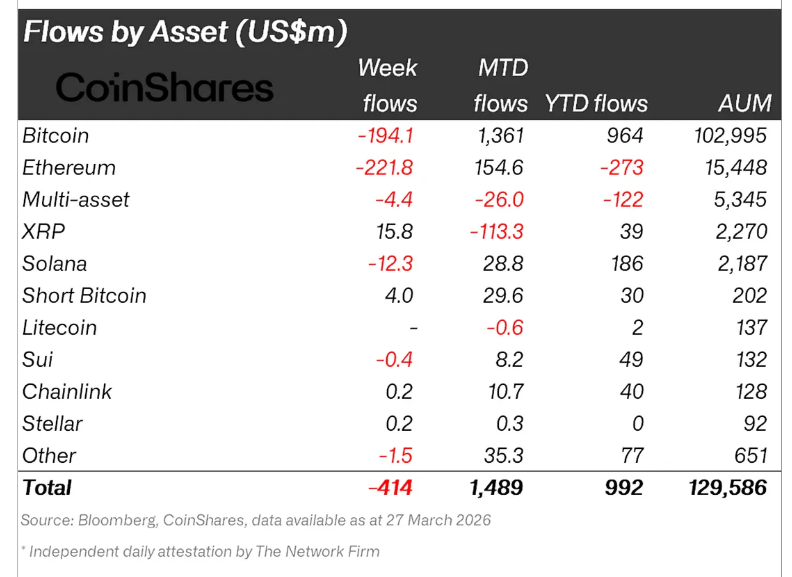 The total outflows of $414 million marked the end of five consecutive weeks of positive inflow activity. Data from CoinShares indicates that this reversal was largely driven by macroeconomic influences rather than specific issues within the crypto market itself.