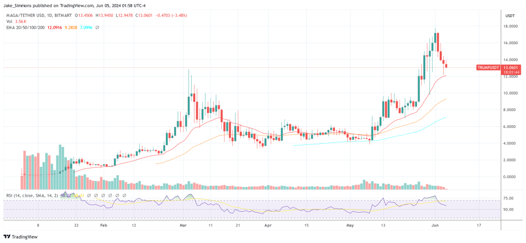 Currently, the Trump memecoin (MAGA) trades at $13.06.