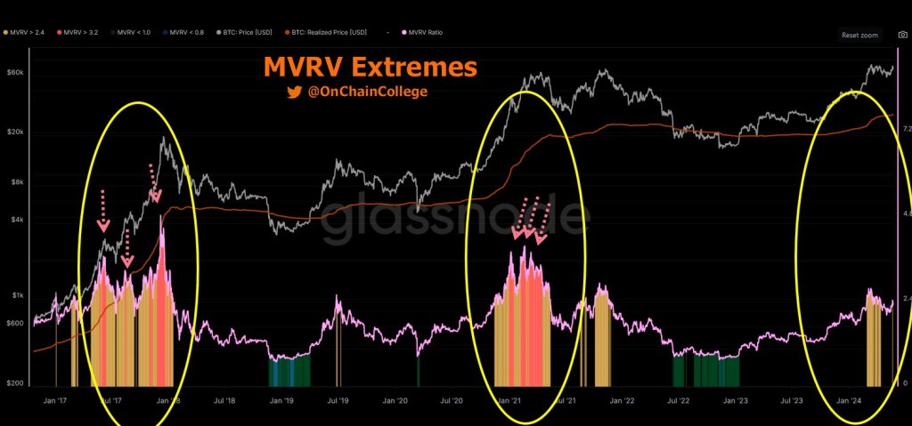 The MVRV ratio compares Bitcoin’s market cap to the total realized cap of all BTC in circulation and tends to fluctuate with price movements. High MVRV ratios historically coincide with market peaks, implying potential overvaluation by investors. Current MVRV levels are deemed significant compared to past bull cycles, suggesting a lackluster rally.