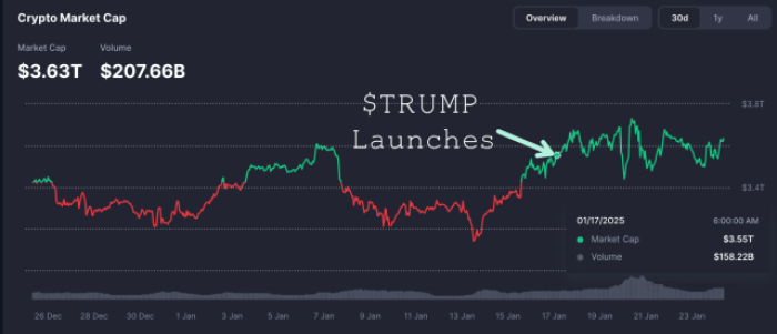 The meme coin market cap surged by $5B between January 17 and 19, before experiencing a sharp decrease on Inauguration Day (possibly because Trump didn’t mention anything about crypto).