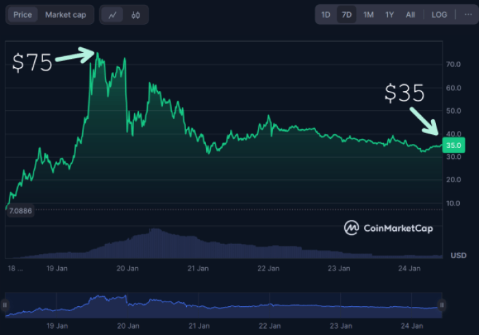 Its value soared to $75 on January 19, only to plummet to $39 the next day. Currently, it stands at $34.76, showing minimal signs of recovery.