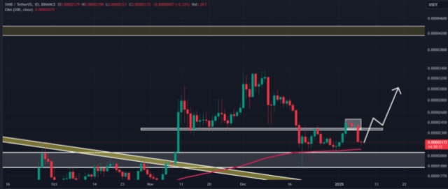Technische analyses tonen aan dat de recente prijsdaling SHIB heeft gebracht naar een significante horizontale steunlijn, samen met de 200 EMA op een dagelijkse tijdschaal. Deze positie maakt SHIB optimistisch voor een potentiële stijging.