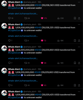 Op 3 januari 2024 doorbrak SHIB een bullish dubbel bodem patroon en begon aan een consolidatiefase. Deze consolidatie duurde bijna drie dagen, waarin een whale 8,18 biljoen SHIB, ter waarde van $195,1 miljoen, van Crypto.com naar een privésleutel verzond.