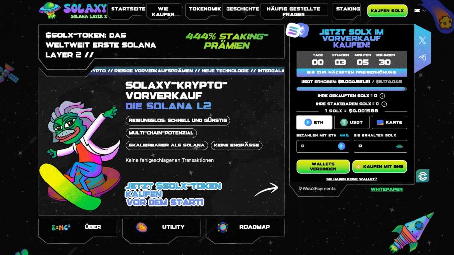 Solaxy ist ein innovatives Projekt, das bald auf dem Kryptomarkt durchstarten könnte. Es bietet eine Layer 2-Lösung, die bestehende Herausforderungen im Solana-Ökosystem adressiert. Durch verbesserte Skalierbarkeit und schnellere Transaktionen könnte Solaxy das volle Potenzial von Solana ausschöpfen. Interessierte Anleger müssen die Kryptowährung SOLX während des Presales erwerben, da sie bislang nicht an offiziellen Börsen erhältlich ist, sondern nur über die offizielle Website.