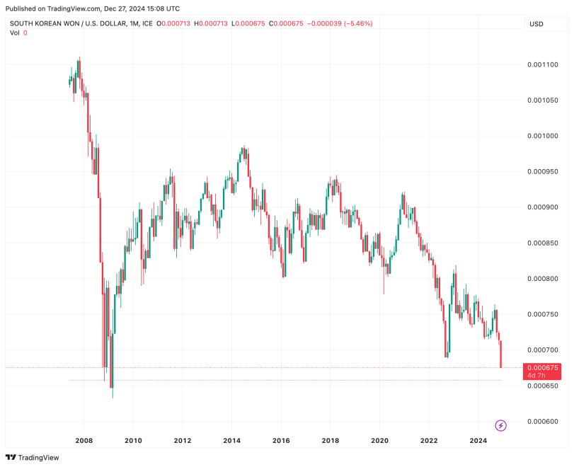 Ki Young Ju, CEO of CryptoQuant, has indicated that the KRW-USD exchange rate has hit a 15-year low, showcasing a lack of trust among South Koreans toward their currency. As the won depreciates, many South Koreans are turning to assets like Bitcoin to protect their purchasing power during uncertain economic conditions.