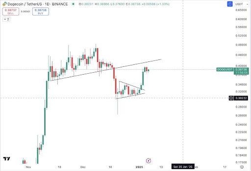 The market expert foresees a possible retest around the $0.41 resistance, which could be crucial in achieving a new all-time high. They also indicated that a support zone at $0.3 is forming, which may help stabilize DOGE’s price if a pullback occurs.