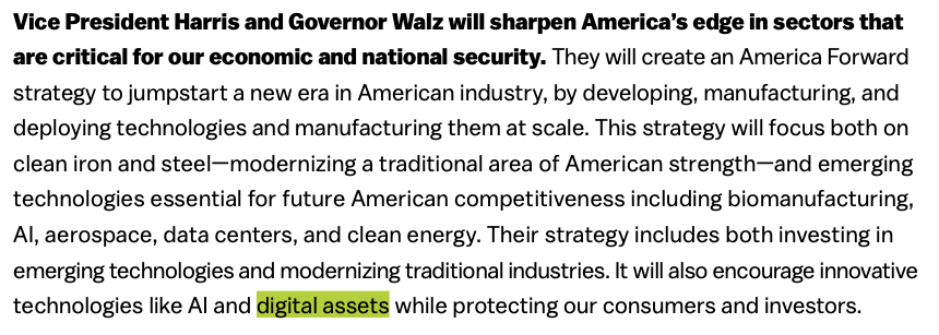 Additionally, her campaign released an 80-page economic plan that only briefly mentions digital assets, mirroring her earlier comments.